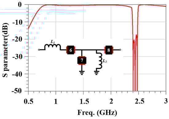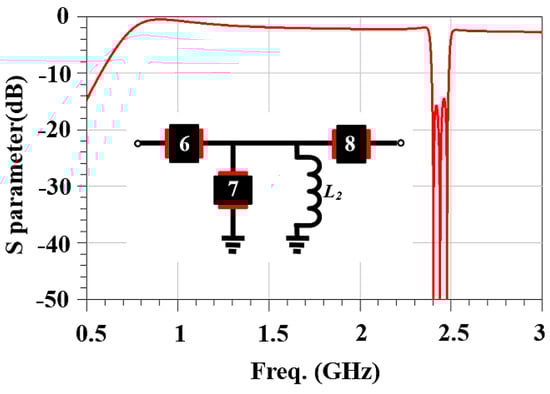 Outside of the stop band, consider the frequency behavior of the filter in the low-frequency range of 0.7 to 2.3 GHz and the high-frequency range of 2.484 to 2.7 GHz. In both frequency ranges, resonators 6, 7, and 8 behave like capacitors. In the low-frequency range, resonator 7 in shunt with inductor L2 is inductive, and the setup behaves like a high-pass filter. In the high-frequency range, it behaves like a capacitor, and the setup behaves like a capacitor. Figure 8 shows a frequency response in which the performance is not ideal.
