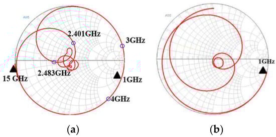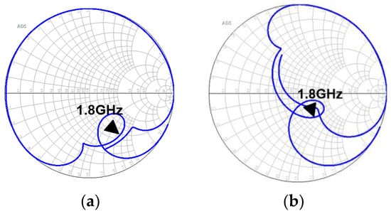 The Smith chart in Figure 9a shows that the capacitive effect is too prominent at close to 1.8 GHz. This is addressed by adding a series inductor to achieve an impedance of approximately 50 Ω at around 1.8 GHz. The Smith chart in Figure 9b shows that there is a significant improvement in matching in the higher-frequency range than at the design frequency. The overall frequency response is shown in Figure 10.