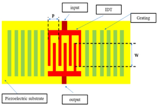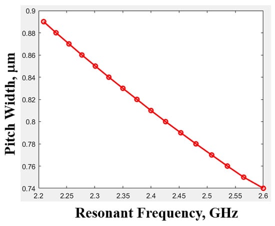 Figure 12 shows the IDT structure of a single-port resonator. To extract the physical parameters of the structure, the experimental data and numerical curve fitting are required to predict the characteristics of a SAW resonator []. The relationship between pitch (p) and is plotted using the experimental data, which were measured by the manufacturer, and the curve is shown in Figure 13. The piezoelectric material for this study is , and the electrode thickness is 0.17 µm, the IDT pair is 200, the grating order is 20, the aperture length W is 50 µm, and the experimental data for the pitch width p of the resonator range from 0.89 µm to 0.74 µm (with an interval of 0.01 µm).
