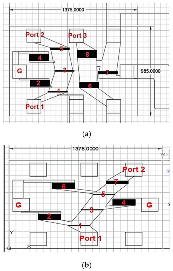 Figure 7a shows the frequency response for in the optimized antenna-plexer. In the 2.4 GHz WIFI band, the insertion loss to WIFI port 2 is less than 3 dB and to WIFI 6E port 3 is less than 2 dB. Figure 7b shows the frequency responses for and . There is only one inductor, so the return loss in the antenna port in the 2.4 GHz WIFI band (< −8 dB) and WIFI 6E (< −9 dB) is not ideal.