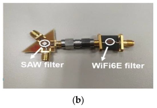 Given the parameter values for the IDT structure in Table 5 and Table 6, the layout circuits are configured using the topologies in Figure 2 and Figure 4. Figure 14a,b show the top view layout, with a circuit area of 1.375 mm × 0.985 mm. The device-under-test (DUT) is then packaged to become the prototype module. The packaged modules for the SAW extractor and the UHB + MHB diplexer are respectively shown in Figure 15a,b.