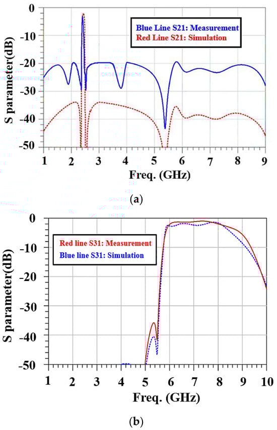 For the UHB + MHB diplexer, the product specifications are shown in Figure 17 and Table 8, and the performance for the passband (WIFI 6E band) is excellent. For , the measured and simulation results in the passband (2.4 GHz WIFI band) differ by 1.2 dB. ( is −3.2 dB in the passband and −20 dB in the stopband. is −2 dB in the passband and −40 dB in the stopband.) The return loss and isolation, which are shown in Figure 17c,d, are respectively greater than 10 dB and 25 dB in the passbands for the 2.4 GHz WIFI and WIFI 6E bands.