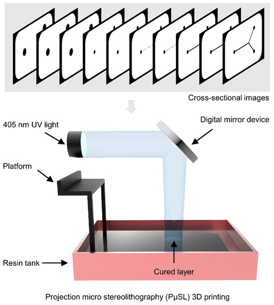 Schematic illustration of the PμSL 3D printing process for fabricating a microfluidic mixer.