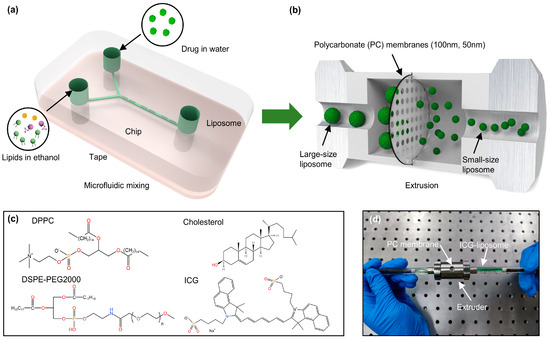 Preparation of L-ICG-Lipo and S-ICG-Lipo. (a) Schematic illustration of the formation of L-ICG-Lipo using microfluidic mixing. (b) Schematic illustration of the generation of S-ICG-Lipo by extrusion. (c) Chemical structures of ICG-loaded liposome components. (d) Photograph of the extrusion process.