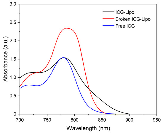 UV–vis spectra of free ICG, ICG-loaded liposome, and broken ICG-loaded liposome.