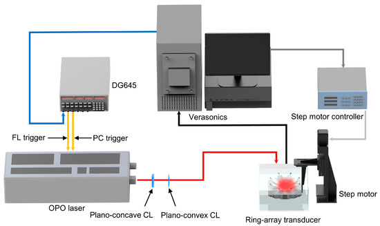 Schematic of the designed PACT system. During illumination, all lasers fire at 20 Hz. Verasonics: ultrasound study platform; DG645: digital delay/pulse generator; OPO laser (10 ns pulse duration, 20 Hz); CL: cylindrical lenses.