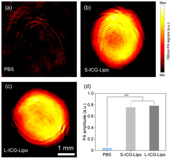 The evaluation of PA performances of L-ICG-Lipo and S-ICG-Lipo. (a–c) PA images of PBS, S-ICG-Lipo, and L-ICG-Lipo. (d) Comparison of PA amplitudes of PBS, S-ICG-Lipo, and L-ICG-Lipo. Statistical significance was considered for p-values below 0.05 (*** p < 0.001).