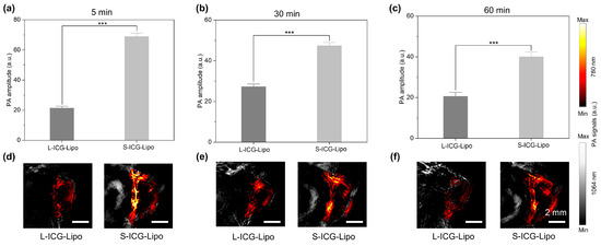 Quantitative analysis of the PA amplitude in tumor sites. (a–c) The comparisons of PA amplitude of L-ICG-Lipo and S-ICG-Lipo in tumor sites at 5 min, 30 min, and 60 min points. (d–f) Representative PA images of the tumor region obtained at 5 min, 30 min, and 60 min points in L-ICG-Lipo and S-ICG-Lipo groups. Statistical significance was considered for p-values below 0.05 (*** p < 0.001).