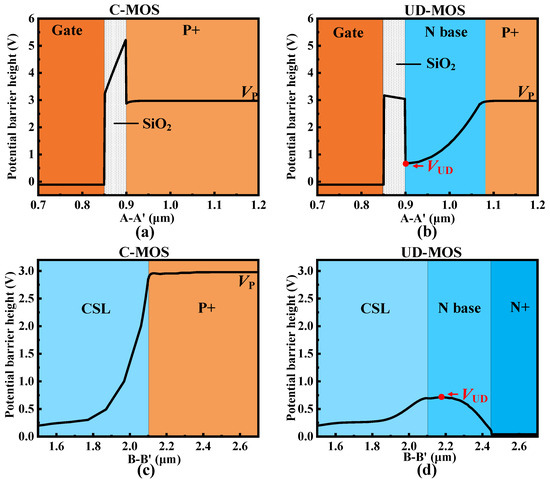 For the zero-bias condition, the potential barrier distribution of the integrated unipolar diode of UD-MOS is shown in Figure 2. Compared with the body diode of C-MOS, the decrease of potential barrier from the P+ region to the SiC/SiO2 interface (i.e., along line A′-A of Figure 1) makes a relatively low potential barrier (i.e., VUD) for electrons transported from the CSL to N+ region. It should be noted that the VUD is still relatively higher than the potential barrier of the CSL region and the N+ region as shown in Figure 2d. In other words, the electrons cannot flow through the N base region to the N+ region under this condition.