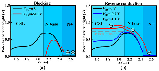 When in blocking condition, although the increasing VDS lowers the barrier of the CSL region and N base region due to the drain-induced barrier lowering effect, the VUD is still high enough to ensure blocking capability, as shown in Figure 3a. When in the reverse conduction condition, the potential barrier of the CSL region is raised by the negative VDS. Once the potential barrier of the CSL region exceeds VUD, the electrons from the CSL region can flow through the N base region to the N+ region, as shown in Figure 3b. Therefore, the potential height of the N base region determines both the blocking and reverse conduction characteristics of UD-MOS. Furthermore, a barrier height analysis model is given here to inform the design of the VUD as follows,