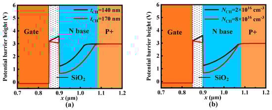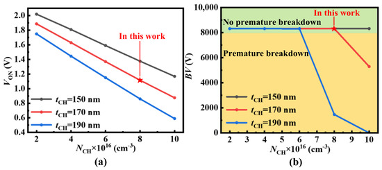 where VP is the potential barrier height of P+ region, ϕSi,SiC is the work function difference between N-type polysilicon and the P+ region, εSiC is the dielectric constant of SiC, εox is the dielectric constant of oxide, q is the elementary charge, tCH is the thickness of the N base region, and NCH is the doping concentration of the N base region, respectively. According to (1), even though the negative VGS can enhance blocking capability by increasing the VUD, it also results in a high reverse conduction voltage VON of UD-MOS. Moreover, the positive VGS even reduces the VUD to make the unipolar diode turn on, causing the UD-MOS to lose gate control when in the forward conduction condition [17]. Therefore, the dummy gate not controlled by the gate electrode is introduced to guarantee both the forward and reverse conduction capability. Furthermore, the thickness tCH and doping concentration NCH of the N base region also affect the VUD. With the increase of tCH and NCH, the VUD decreases, as shown in Figure 4. The influence of breakdown voltage (BV) and VON on tCH and NCH is discussed further in the following section.