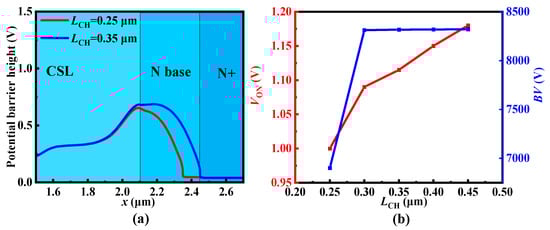 The effect of the N base length LCH on VUD is also discussed. With the narrowness of LCH, the potential of the N+ region influences the potential barrier of the N base as shown in Figure 6a. Although the lower VUD helps to reduce the VON, the BV is weakened at the same time, as shown in Figure 6b.