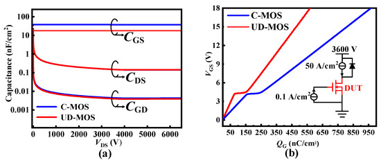 Moreover, the dummy gate of the UD-MOS reduces the effective overlapping area between gate and drain terminals, so that the gate-to-drain capacitance (CGD) is 4.01 pF/cm2 (@VDS = 3600 V), which is reduced by 9.5% compared with the C-MOS. Meanwhile, due to the thick oxide layer between the trench gate and dummy gate as well as a slightly smaller overlapping area, the gate-to-source capacitance (CGS) of the UD-MOS is 18.1 nF/cm2, which is reduced by 52%. Accordingly, thanks to the smaller CGD and CGS, the UD-MOS has a lower gate charge (QG) of 566 nC/cm2 (@VGS = 0 V–18 V) and gate-to-drain charge (QGD) of 109 nC/cm2, as shown in Figure 11. Furthermore, considering conduction and dynamic capability, the UD-MOS exhibits a better loss-related figure of merit (FOM, i.e., RON × QGD [21]) of 3.87 mΩ·μC, which is 8.7% lower than that of the C-MOS.