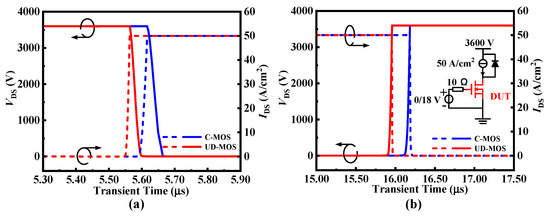 (a) Turn-on and (b) turn-off waveforms of the C-MOS and UD-MOS at VDS = 3600 V and IDS = 50 A/cm2.