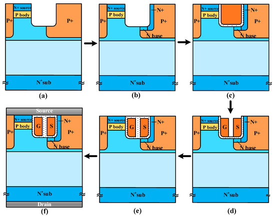 One feasible process flow of the UD-MOS is presented, including (a) epitaxial growing, P body implantation, N+ source region implantation, trench etch and P+ region implantation, (b) N+ region and N base region implantation, (c) thermal oxidation and polysilicon gate deposition, (d) polysilicon etch, (e) isolated oxidation deposition and (f) metallization, as shown in Figure 13. Finally, Table 2 compares the main characteristics of the SiC UD-MOS and the C-MOS. The SiC UD-MOS exhibits superior performance due to the unipolar diode.