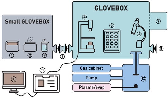 We were encouraged to simplify the “clean room in the glove box” concept and propose a more cost-effective solution. Our key idea involves utilizing the same compact home-made setup for both stack assembly and mini-contact mask lithography []. For metallization processes, sputtering, or plasma etching we use a reconfigurable vacuum chamber with direct access from the glove box. For liquid processes we use a second glove box connected to the main one through the load lock. Our system also enables the transfer of samples for resistivity measurements in the inert atmosphere: for this purpose, the glove box is equipped with a microscope to mount the sample onto the measurement socket.