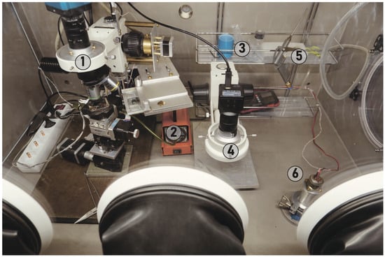 We use a 1.1 × 0.7 × 0.8 m3 nitrogen glovebox with a gas purification system and three gloves. The glovebox is equipped with a load lock (# 7 in Figure 1). A home-made transfer machine combined with contact mask optical lithography is the key component of the glovebox (marked by # 4 in Figure 1; see detailed discussion in Section 2.3). A second microscope with low magnification and long focal length (marked by # 6 in Figure 1) is necessary for visual inspections, with manual gluing of the contacts to the pads (see example in Figure 7f). Inside the glovebox there is also storage for the components (crystals, substrates, samples, tapes) and tools, including scissors and tweezers (# 5 in Figure 1). We do not place the computer inside the glovebox to reduce heat dissipation and problems with service. Instead, we feed numerous cables through the wall of the glovebox. Special care should be taken to avoid gas leakage through the wires. For this purpose, we used a sealing kit by Roxtec (Accessed on 30 December 2023). A special KF40 port allows samples to be transferred from the glovebox directly to the measurement device (# 8 in Figure 1). The components of the glove box are shown in Figure 3.