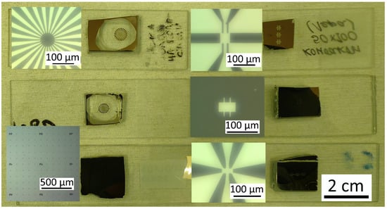 The metallographic microscope is equipped with a 4-position objective turret. Three objectives are used (5× NA 0.15, 10× NA 0.25, and 20× NA 0.4). The fourth position contains an LED, which is used for exposure of the photoresist through the shadow contact mask in the regime of the lithographer. The resolution of such mask lithography is below 2 μ m and the precision of alignment is about 1 μ m. The masks are manufactured out of ready-made electrochemically chrome-coated glass plates. We employ direct laser writing photolithography and liquid chromium etching to define the design. A library of standard masks (shown in Figure 4) enables us to perform lithography on samples of flakes and heterostructures of various shapes and sizes. In more detail, the processes of mask fabrication and lithography are described in Ref. [].