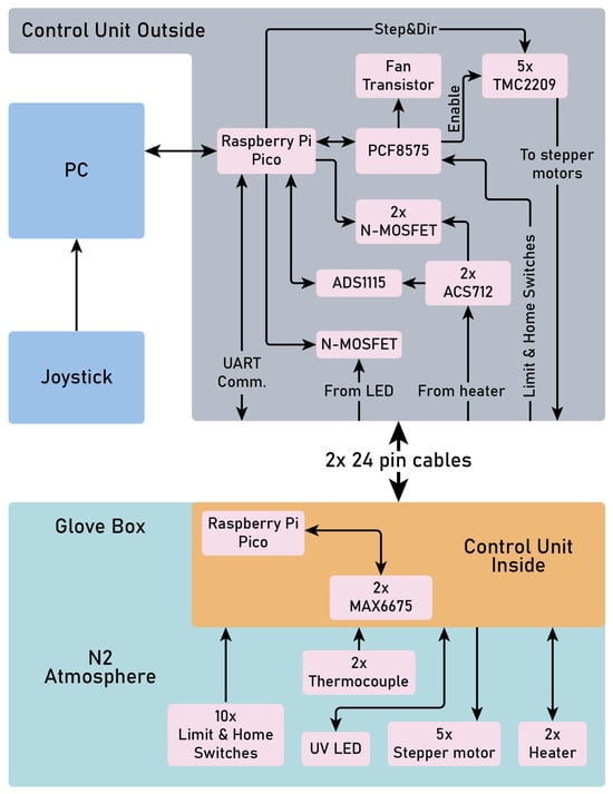 The idea is to place the unnecessary heat-generating components, such as stepper motor controllers, outside the glovebox for better thermal management. Two control units are connected with two 24-pin cables.
