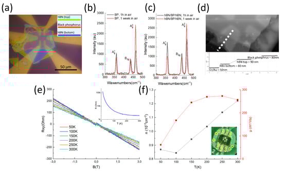 Figure 7. (a) Black phosphorus heterostructure hBN/BP/hBN obtained using the setup. Optical image of the heterostructure with metal contacts. (b,c) Raman spectra of BP after 1 h and 1 week in air, respectively. (d) AFM characterization of the hBN/BP/hBN heterostructure. hBN bottom ≈ 80 nm, BP ≈ 80 nm, and hBN top ≈ 90 nm. (e) R x y measurements of the heterostructure at different temperatures. The inset shows the resistance R x x as a function of temperature T. (f) Temperature dependence of the mobility and carrier density in a flake of black phosphorous. The inset shows a photo of the sample at the socket with silver paint glued contacts.