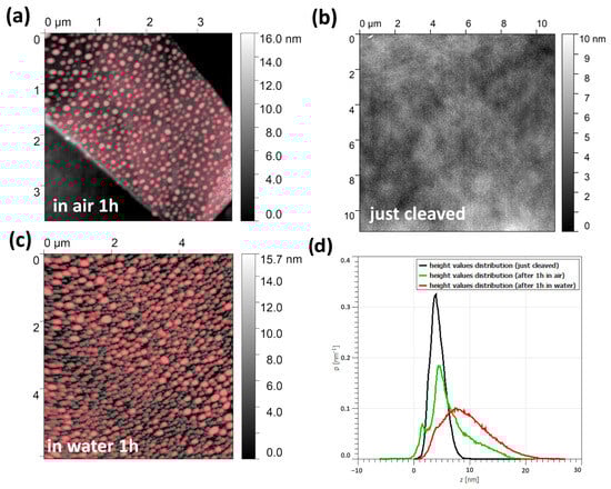 Figure 8. (a) AFM topography of black phosphorus after one hour under ambient conditions (bubbles are colored red). (b) AFM topography of the just-cleaved black phosphorus. (c) AFM topography of black phosphorus after one hour in deionized water (bubbles are colored red). (d) Comparison of height value distributions on the surface of BP: red, after 1 h in water; green, after 1 h in air; and black, just cleaved.