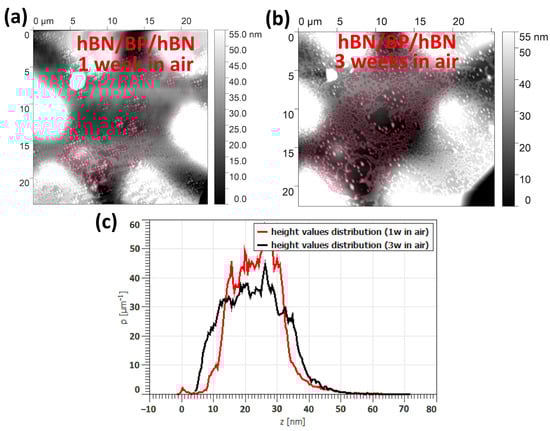 To demonstrate that the degradation occurs even under the hBN layer, we stored an hBN-covered BP structure with bottom contacts under ambient conditions and performed AFM scans of the top hBN surface. The red color in Figure 9a,b shows the height changes observed after one and three weeks of exposure to air, respectively. The height distribution in these two cases is shown in Figure 9c. It is important to note that certain local areas did not exhibit degradation, indicating a probable tight adjustment between BP and hBN in these regions.
