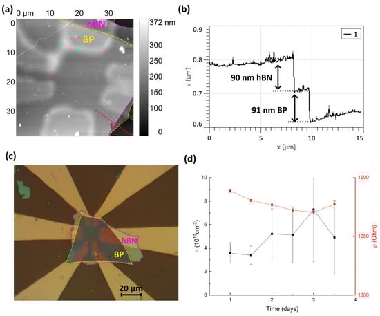 Figure 10. (a) AFM topography of the heterostructure hBN/BP with metal contacts. (b) Slice of line 1. The height of the BP is 91 nm, and the height of the hBN is 90 nm. (c) The optical image of the hBN/BP heterostructure. (d) Temporal variation in carrier density and resistivity for encapsulated black phosphorous structure (shown in the inset).