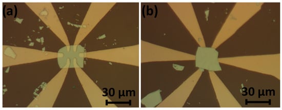 Figure 11. (a) Optical image of the Bi2Te3 flake under the metal contacts. (b) Optical image of the Bi2Te3 flake on the metal contacts.