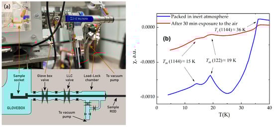 Through the KF40 port, the samples can be transferred directly for measurements (transport or magnetic susceptibility) in the inert atmosphere. For this purpose, a gate valve is adjusted to the evacuated load lock chamber of the cryostat sample holder, as shown in Figure 12a. We use the Cryogenic load locked system for resistivity measurements and magnetometry. The sample is mounted in the glove box, then moved to the load lock. The gate and glove box valves are closed and the load lock is evacuated. The stick with the load lock and its gate valve is transferred to the gate-valve-terminated cryostat. Figure 12b shows the temperature dependencies of the magnetic susceptibility of a EuCsFe4As4 single crystal with inclusions of the EuFe2As2 phase. The crystals of EuCsFe4As4 were grown by the “self-flux” method and selected from the batch presented in Refs. [,]. The crystals were stored in a glove box and then mounted to the three-coil cell for magnetic susceptibility measurements. The measurements of the fresh sample are shown by a blue curve and demonstrate an abrupt superconducting transition at 36 K, as well as the magnetic transition of the Eu subsystem at 15 K, inherent to the (1144) system, and also a magnetic transition at 19 K for the inclusions of the EuFe2As2 phase. Then, the sample was taken out of the setup and subjected to ambient conditions for 30 min and measured again. It can be seen that the sample exposed to air had degraded (red curve in Figure 12b); all superconductive and magnetic features are smeared.