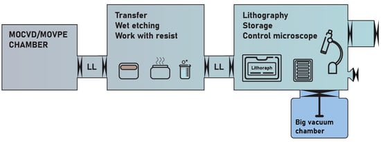 Building up such a cluster starts with the choice of materials and goals. Air-stable 2D layers of graphene [] and boron nitride [] could be fabricated outside. Industry-compatible processes for the other 2D materials (MOVPE/MOCVD) require toxic gases and should be adjusted in advance. A chamber with planar layer fabrication should have a port to the inert-atmosphere glove box with a load lock to the liquid processing chamber. Liquid processes include photoresist coating and baking, wet etching, photoresist development, delamination of 2D layers from the substrates, liquid wafer-scale transfer [], and acid treatment [] to improve the quality of TMDCs. The atmosphere in this box is basically contaminated by the vapors of various liquids. Similarly to our setup, one should avoid the storage of 2D materials here.
