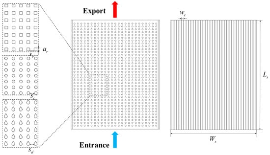 Figure 2 shows the geometric structures of a rectangular channel heat sink (hereinafter referred to as channel heat sink) with square, round, and drop section pin fin arrays. Referring to the common geometric dimensions of the embedded liquid cooling heat sink [,], and considering comparability, the characteristic length of the liquid flow channel in the four types of heat sinks is taken as 0.3 mm and the volume of solid materials in the four types of embedded heat sinks is equal, at 9.910−8 m3. The length, width, and height of the heat sink are 15,000, 13,000, and 1000 μm, respectively, and the thickness of the heat sink wall is 200 µm. The numbers of straight channels and pin fins were 26 and 25, respectively. Table 1 shows the dimensions and parameters of the geometric model [,]. Here, the equation for the pin fin contour curve of the drop section is given by,