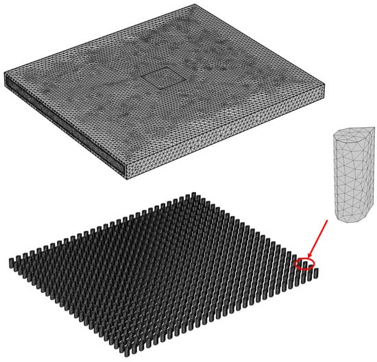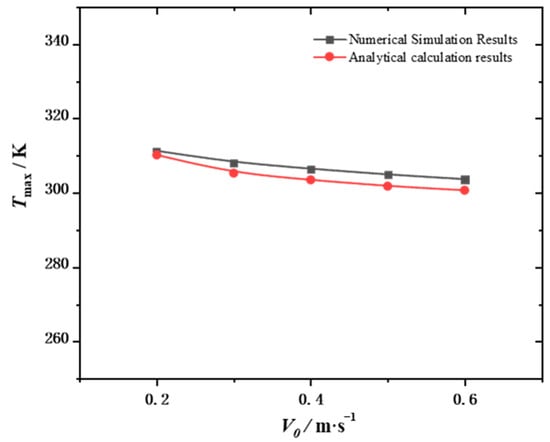 In this study, COMSOL Multiphysics5.6 was used to solve Equations (3)–(8) under the corresponding boundary conditions. To ensure the accuracy of the calculation, the independence of the grid was verified. The grid numbers were 377,988, 613,745, 1,186,150, 3,412,455, and 8,621,621, corresponding to 307.70, 308.24, 310.79, 311.57, and 312.19 K, respectively. The relative errors were 1.44%, 1.27%, 0.45%, and 0.20%, respectively. The grid numbers 613,745, 1,186,150, 3,412,455, and 8,621,621 correspond to 142,945, 131,562, 121,960, and 118,460 Pa, respectively, with relative errors of 20.7%, 11.1%, and 3.0%, respectively. Considering the computing efficiency, the partition strategy with mesh number 3,412,455 was selected. Figure 3 shows the grid division diagram of the model. To further verify the accuracy of the numerical model, this study used the analytical method reported in a previous study [] to derive the analytical formula for the thermal resistance of the heat sink of the pin fins and obtain the analytical solution for the maximum temperature of the heat sink. The comparison with the numerical simulation results in this study is shown in Figure 4.