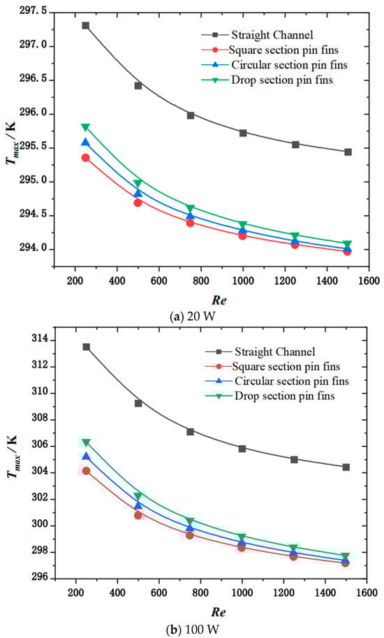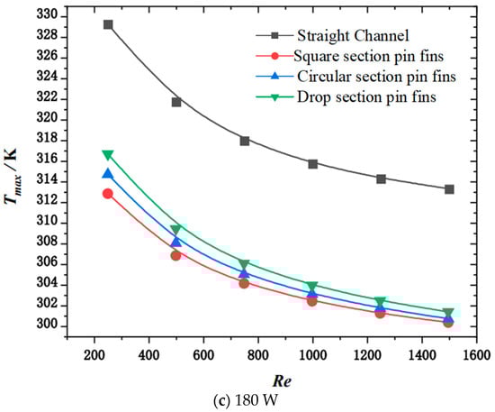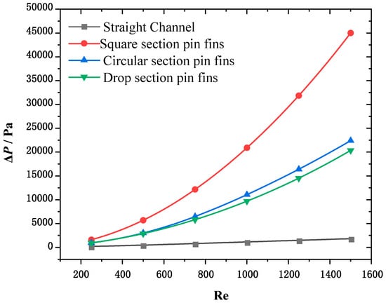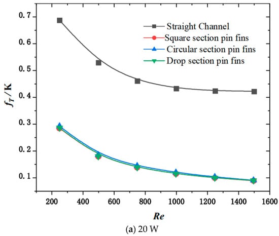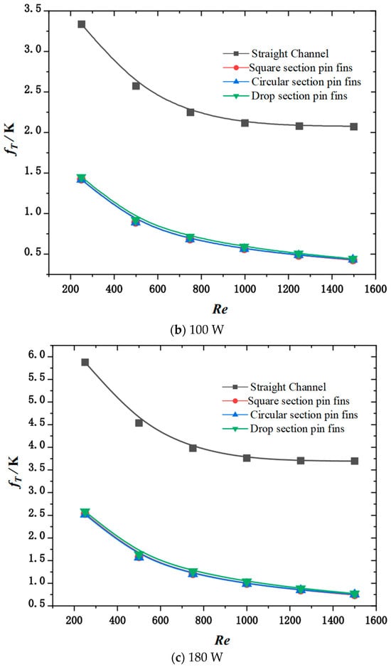 Figure 7 shows the variation rules for with changes in the Reynolds number and channel type under the conditions of uniform thermal load at different powers. It can be seen from the figure that, for the four structures, the heat sink values corresponding to decrease as the Reynolds numbers increase. Additionally, the change curve gradually levels off. Under the same heat source load, the values for the heat sink with Reynolds numbers are close to each other. It can be seen from the figure that the heat sink of the rectangular section of the needle pin fin has the strongest hindering effect on the coolant flow and the strongest heat dissipation capacity. This is due to the fact that the face of the rectangular needle pin fin is flush, the fluid is highly separated when bypassing the rectangular needle pin fin and the fluid disturbance is stronger. At the same time, the contact area of the rectangular needle pin fin is the largest, thus the heat dissipation capacity is strongest.