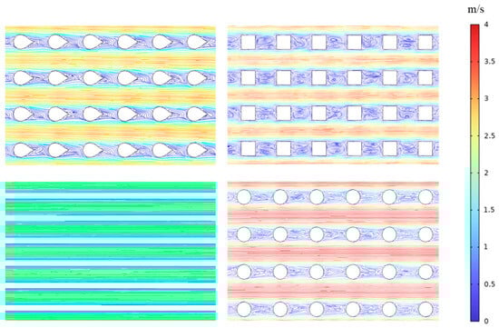 Figure 5 shows the variations in the four heat sinks with the inlet Reynolds number. Figure 6 shows the internal flow diagrams of the four heat sinks when the inlet Reynolds number is 1500.