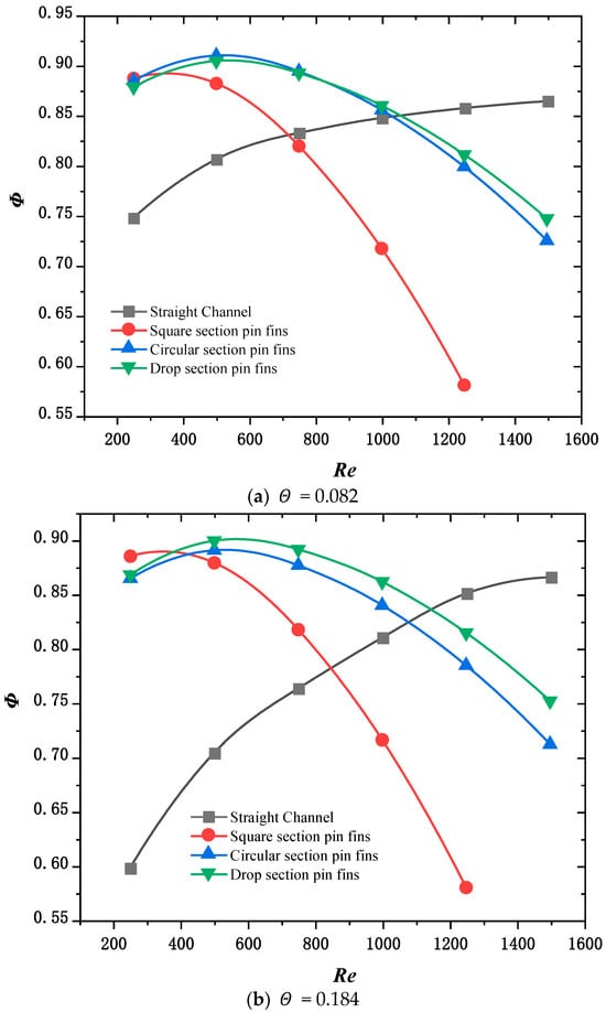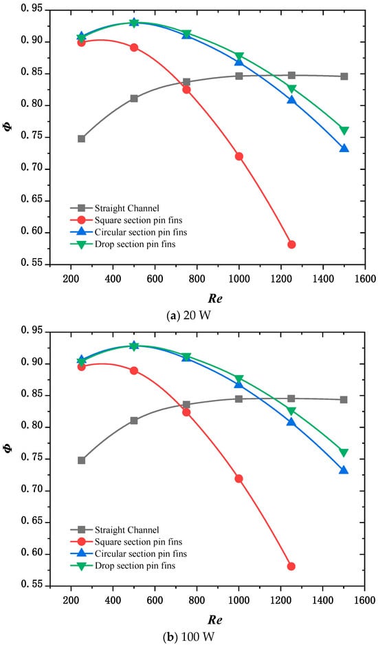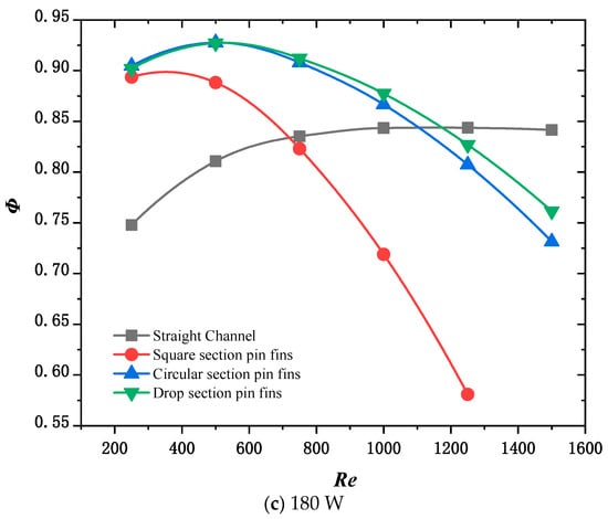 Figure 8 shows the variation rules for with the change in Reynolds number and channel type under uniform thermal loads at different powers. It can be seen from the figure that, for the four structures, the heat sink values corresponding to decrease as the Reynolds number increases. Additionally, the change curve gradually levels off. Under the same heat source load, the values of the heat sink with Reynolds numbers are close to each other.