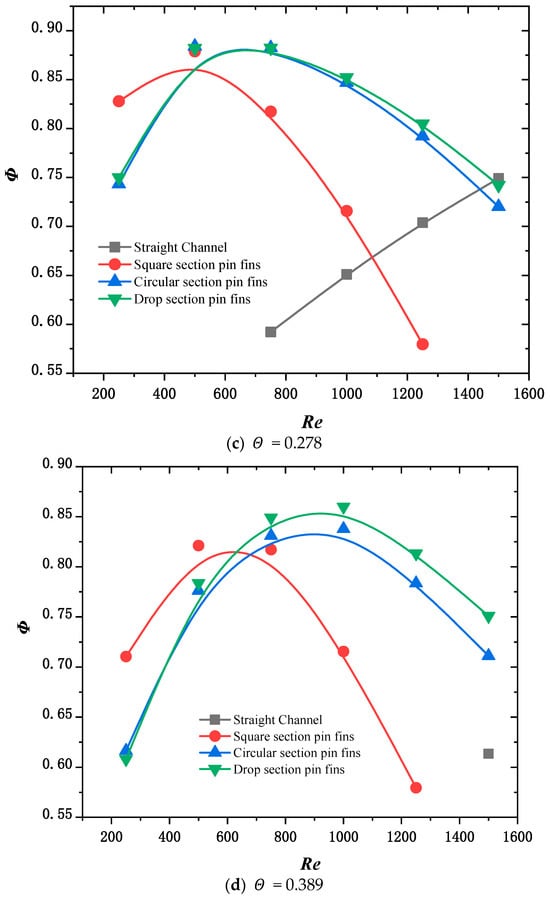 The weight of the composite performance index is like that of the uniform heat source. The figure shows that when the power dispersion is 0.082, 0.184, or 0.278, of the heat sink of the pin fin of the circular and drop-shaped sections first increase and then decrease with the increase in the inlet Reynolds number. When the power dispersion is 0.389, of the heat sink of the channel, circular section, and drop section increases with increasing Reynolds numbers between 250 and 1500. At the same time, the composite performance indexes of the channel heat sink range from 250 to 1500, which are lower than those of the pin fin heat sink. This is because as the thermal load of the heat source increases when the power dispersion is 0.389, the pressure drop loss caused by the increase in the Reynolds numbers of the three structures is less than the benefit generated by the increase in cooling capacity. Moreover, the cooling capacity of the channel heat sink cannot fulfill the corresponding cooling demand; therefore, of the channel heat sink is significantly smaller than the micro pin fin heat sink. With increasing Reynolds numbers, the heat sink of pin fins of the square section first increases and then decreases. This is because the pressure drop loss caused by the increase in the Reynolds number caused by the heat sink of the pin fin with the square section is greater than the gain caused by the increase in the cooling capacity.