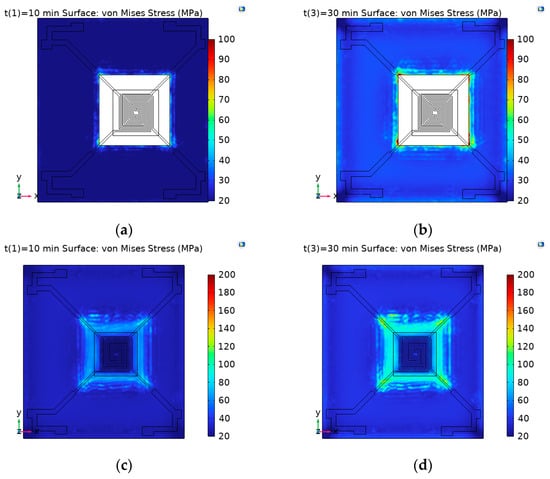 In the transient equation study, the output time and step size were set. The output time ranged from 0 min to 35 min, with a step size of 10 min. In other words, the heat transfer in solids analysis of the study target was sampled every 10 min over a 35 min period. In the extended study section of the stationary analysis, auxiliary scanning was set with time t as the scanning parameter. The same time step as in the transient analysis was used, thereby linking the transient and stationary analyses. The stress distribution in three different states is shown in Figure 4: