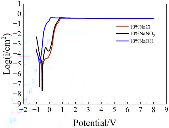 Figure 1 shows the polarization curves of the molybdenum sample in three different solutions. It was obvious that whether in an alkaline solution or in a neutral solution, after reaching a certain potential, the polarization curves reached a constant level and were at the same level of height. However, the electrolytic reaction characteristics of molybdenum in alkaline solution and neutral solution were also significantly different. The active potential of molybdenum in the alkaline solution was lower than that in the neutral solution, and there was an obvious passivation region in the neutral solution. The main reason for the above phenomenon was the OH− ion of the solution. According to Equation (1), molybdenum oxide can be dissolved by reacting with OH− [11]. Therefore, molybdenum in alkaline solution showed stronger electrolytic reactivity, and there was no passivation region. In contrast, in the neutral solution, the amount of OH− was very small, the oxide film was difficult to dissolve naturally, the reaction resistance was large, and the electrolysis reaction rate was slow. However, as the test progressed, under the action of the electric field, the concentration of OH− ions in the solution increased, the dissolution of the oxide film accelerated, the current density gradually increased, and the electrolysis reaction rate also accelerated simultaneously. In addition, molybdenum exhibited an obvious passivation region in the NaNO3 solution. Molybdenum typically forms a stable passive layer in neutral regions. With the involvement of nitrate ions, this passive layer may be further reinforced through oxidation reactions, leading to a distinct passivation zone. As the potential increased, the passivation film dissolved or peeled off, and the dissolution rate of the anode metal began to increase. Through the polarization curves of molybdenum in three different solutions, it was found that molybdenum can undergo an electrolytic reaction in a neutral solution. In particular, there was an obvious passivation phenomenon in the NaNO3 solution, which is beneficial to improving the localization accuracy of electrochemical machining. Therefore, the passivation characteristics of molybdenum in NaNO3 solution were further studied, and the polarization curves of molybdenum in different concentrations of NaNO3 solution were measured.