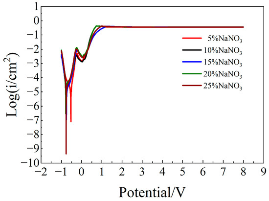 Polarization curves of molybdenum in different concentrations of NaNO3 solution.