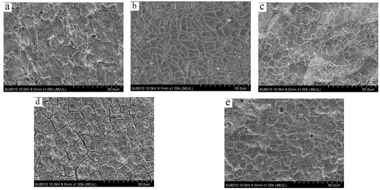 Scanning electron microscopy images of surface morphology of molybdenum electrolyzed in five different concentrations of NaNO3 solution after polarization curve testing: (a) 5% NaNO3 solution, (b) 10% NaNO3 solution, (c) 15% NaNO3 solution, (d) 20% NaNO3 solution, and (e) 25% NaNO3 solution.