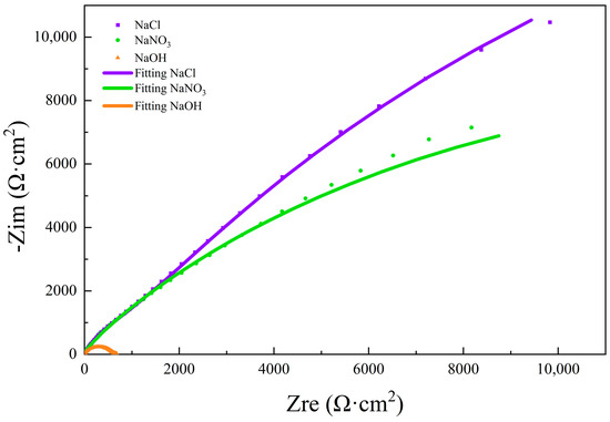 Electrochemical impedance spectroscopy (EIS) experiments were conducted to analyze the electrolytic reaction mechanism of molybdenum in different concentrations of NaNO3 solution further. EIS can effectively characterize the characteristics of the electrochemical system [17] and analyze the effects of electrode kinetics and anode passivation film on the electrolytic reaction [18]. According to the Nyquist diagram, the interface characteristics between the oxide film and the negative electrode of the anode material can be analyzed. When a semi-circular structure is present in the high-frequency region, it indicates the capacitance response of the oxide film. The diameter of the semicircle in the high-frequency region is related to the oxide film, where the oxide film resistance on the surface of the sample increases with the increase of the diameter of the semicircle in the high-frequency region [19]. To understand the effect of the anodic oxide film on corrosion resistance in different solutions, EIS curves of molybdenum in NaCl solutions, NaOH solution, and NaNO3 solution were obtained, and changes in electrochemical characteristics were analyzed.