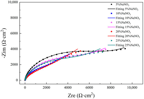 Figure 4 shows the EIS results of pure molybdenum in three different solutions in the form of Nyquist plots. Three kinds of solutions showed an incomplete semicircle, representing the capacitive response of the surface oxide film. It can be seen that the radius in the 10% NaCl solution was the largest, indicating the highest oxide film resistance. The radius in 10% NaOH solution was the smallest, indicating the lowest oxide film resistance. Therefore, the corrosion resistance of molybdenum in 10% NaNO3 solution was the lowest, best facilitating the electrolytic reaction. These results are similar to the electrochemical corrosion characteristics of the polarization curves of molybdenum in three different solutions measured in Figure 1. Pure molybdenum showed a certain tendency for electrolytic reaction in a neutral solution. In 10% NaNO3 solution, the corrosion resistance of pure molybdenum was weakest, and it was easiest to carry out electrolytic processing. Subsequently, EIS tests of molybdenum in different concentrations of NaNO3 solution were carried out.