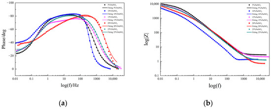 Bode diagrams of molybdenum in different concentrations of NaNO3 solution: (a) Bode phase angle diagram; (b) Bode amplitude diagram.