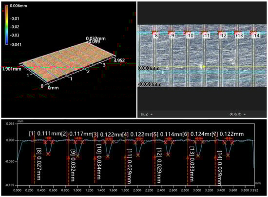The average value of the test indexes of different processing factors at the same horizon is represented by Ki (i represents the horizon), and the range value under each factor is calculated. The larger the range, the greater the influence of the factor on the assessment index, and the more important the factor is to the assessment index. The workpiece after the experiment was measured with a 3D profilometer (Keyence VR5000). Due to the large number of workpieces, it cannot be shown one by one. Take the measurement results of the 20th group of experimental workpieces as an example. As shown in Figure 10, the groove width and groove depth at different positions of the micro-grooves array were measured, and the micro-grooves depth-width ratio Dr and micro-groove width error ∆ were calculated.