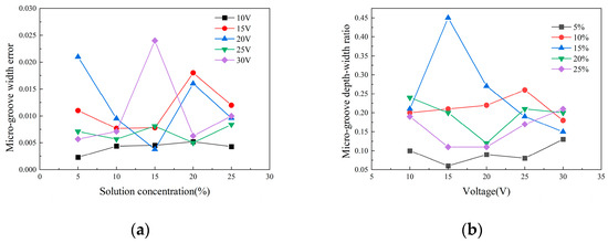 Optimization of micro-groove processing results: (a) Comparison of micro-groove error of molybdenum processed with different concentrations of NaNO3 solution under the same voltage; (b) Comparison of microgroove depth-width ratio of molybdenum processed with different voltages under the same concentration of NaNO3 solution.
