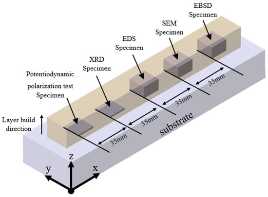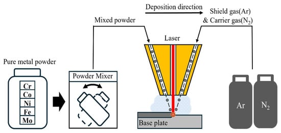 The powders were blended in a powder mixer for three hours to produce HEAs with the composition Cr25-xCo25Ni25Fe25Mox (x = 0, 5, 10%). Table 1 shows the weight percentages (wt%) of the powders. The substrate material used was SUS304, which measured 50 mm in width, 150 mm in length, and 25 mm in height.