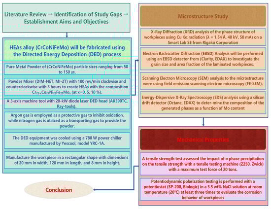 As previously described in a study [], laminations were conducted with 0%, 5%, and 10% Mo to examine the effect of Mo addition. The laminates’ microstructure, tensile properties, and potentiodynamic polarization behavior were examined using X-ray diffraction (XRD), electron backscatter diffraction (EBSD), scanning electron microscopy (SEM), energy-dispersive X-ray spectroscopy (EDS), and potentiodynamic polarization tests at varying concentrations. The research methodology employed in this investigation is illustrated in Figure 2.