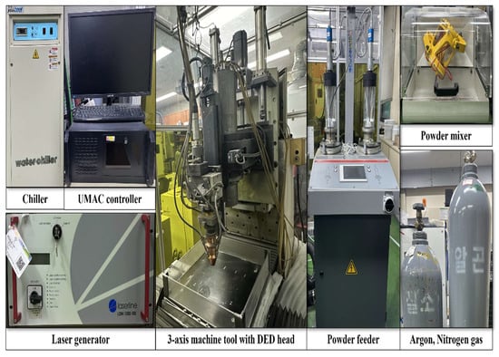 The powder was blended with a powder mixer (DIM-NET, MI-2T, Incheon, Republic of Korea) at 100 revolutions per minute in both clockwise and counterclockwise directions. A 1.5 L capacity twin-disc powder feeder (Twin 150, Oerlikon Metco, Westbury, NY, USA) was used to feed the blended powder into the DED head’s nozzle. The powder was transported and inserted into a nozzle with three holes. Argon gas was used as a protective gas to prevent oxidation, and nitrogen gas was used to transport the powder. The DED equipment was cooled by a 780 W power chiller (Yescool model YRC-1A, Bucheon, Republic of Korea). The experiment’s integrated control was handled by a universal machine and automation controller. To prevent oxidation caused by external air, the DED testing equipment was enclosed.