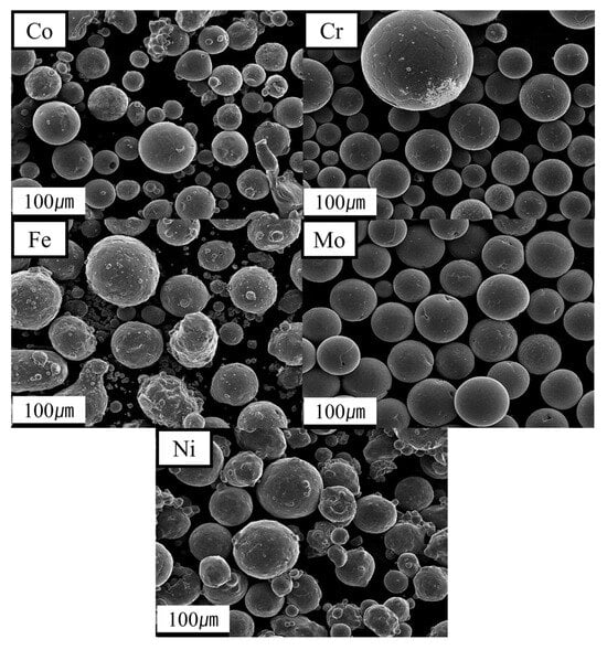 The investigation used spherical powders of pure Cr, Co, Ni, Fe, and Mo obtained from Mk Corporation, Vadodara, India, with particle sizes ranging from 50 to 150 µm. The SEM images of these powders are shown in Figure 4. The decision to choose pure metal powder materials instead of CoCrFeNi pre-alloyed powder and pure Mo powder was influenced by multiple criteria. The use of pure elemental powders enables enhanced flexibility in customizing the composition and microstructure of the final alloy, a critical factor in maximizing unique properties. Moreover, pure powders enable the examination of the contributions of individual elements to the behavior of the alloy, offering a more comprehensive understanding of the material’s performance. Furthermore, this process facilitates the development of high-entropy alloys (HEAs) that offer distinctive properties, including improved mechanical strength and resistance to corrosion [].