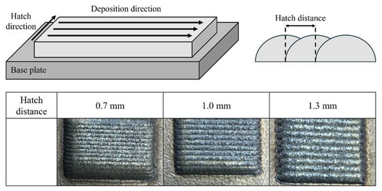 Table 2 shows the parameters of the DED procedure. The hatch distance is critical in determining the quality of the DED process [,]. If the hatch distance is too large, insufficient overlap can cause pores or cracks, reducing mechanical properties. Conversely, if the hatch distance is too small, the material’s height and edges may collapse []. Initial experiments were carried out to determine the ideal hatch distance. Figure 5 depicts the results of these experiments.